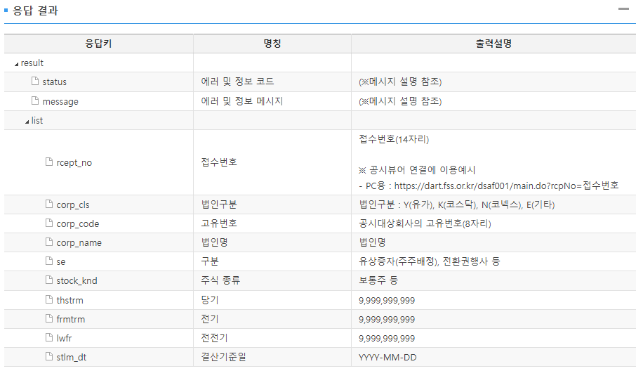 아래는 실제 API의 응답이다. 위의 응답결과에서 설명한 것처럼 각 key가 어떤 뜻인지 맞춰보면 된다.