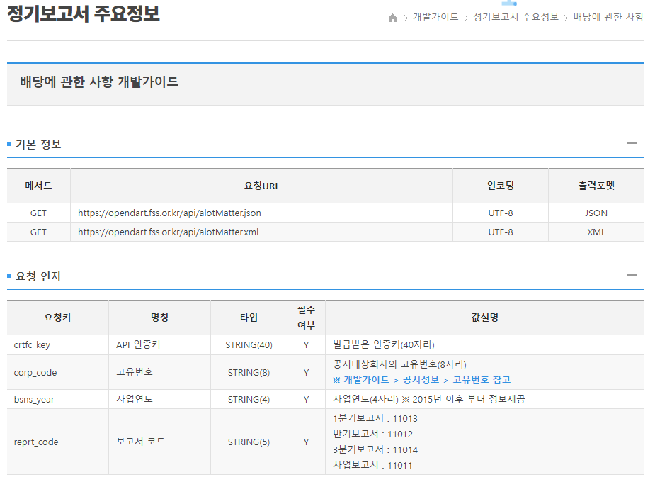 개발가이드 > 정기보고서 주요정보 > 배당에 관한 사항 > 바로가기를 선택하면 해당 API 가이드가 나타난다.